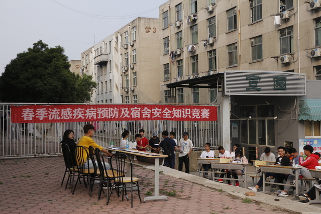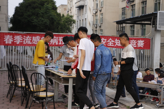活动初赛以笔试的方式举行,5月9日同学们相聚于教三楼,以笔为剑,通过对流感预防知识的学习应用把流感赶出校园。2018年5月12日,春季流感预防及宿舍安全知识竞赛决赛于宣园门口以抢答的形式举行。在第一轮的小组笔试答题中,各小组可谓是展尽风采,对流感的了解及其预防可谓是了如指掌。而第二轮,比赛一开始变进入高潮。同学们唇枪舌剑积极抢答,比赛现场如火如荼。也反应了同学们对预防春季流感和宿舍安全知识的灵活掌握。