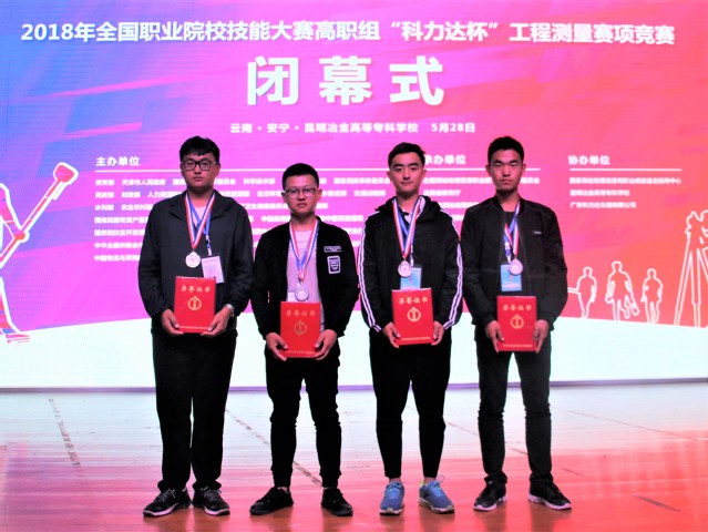 5月28日,2018年全国职业院校技能大赛高职组“科力达杯”工程测量赛项在云南昆明胜利闭幕。由公司建工公司林乐胜、黄国斌两位老师指导的叶相磊(测量15)、汪继东(测量16)、许玉可(测量16)、蒲劲松(遥测16)四位同学组成的参赛队获得团体二等奖。