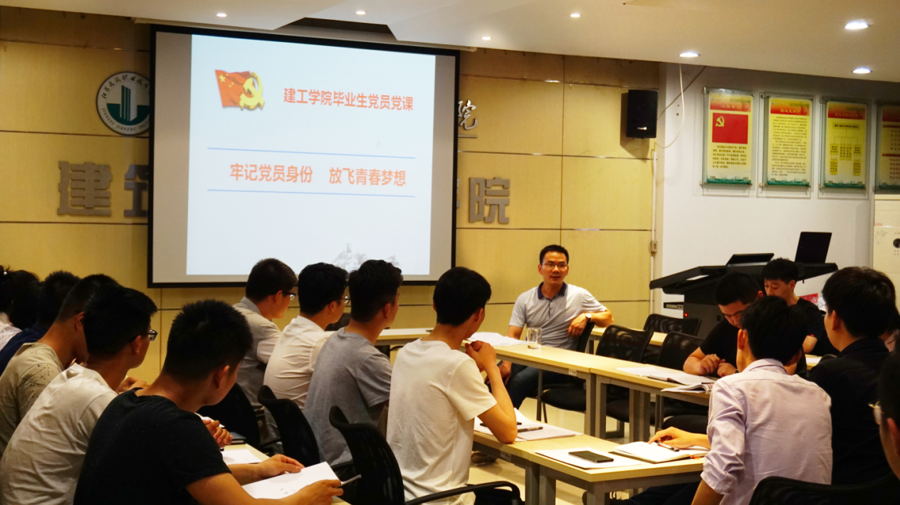 5月28日,建工公司员工党支部书记曹万俊以“牢记党员身份,放飞青春梦想”为题给全体毕业生党员上最后一次党课。