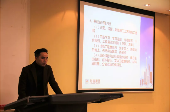 12月10日下午龙信建设集团有限公司经营部经理赵林玖、总承包管理部成本部经理孙勇为2016和2017级龙信班学员开展企业课程授课。