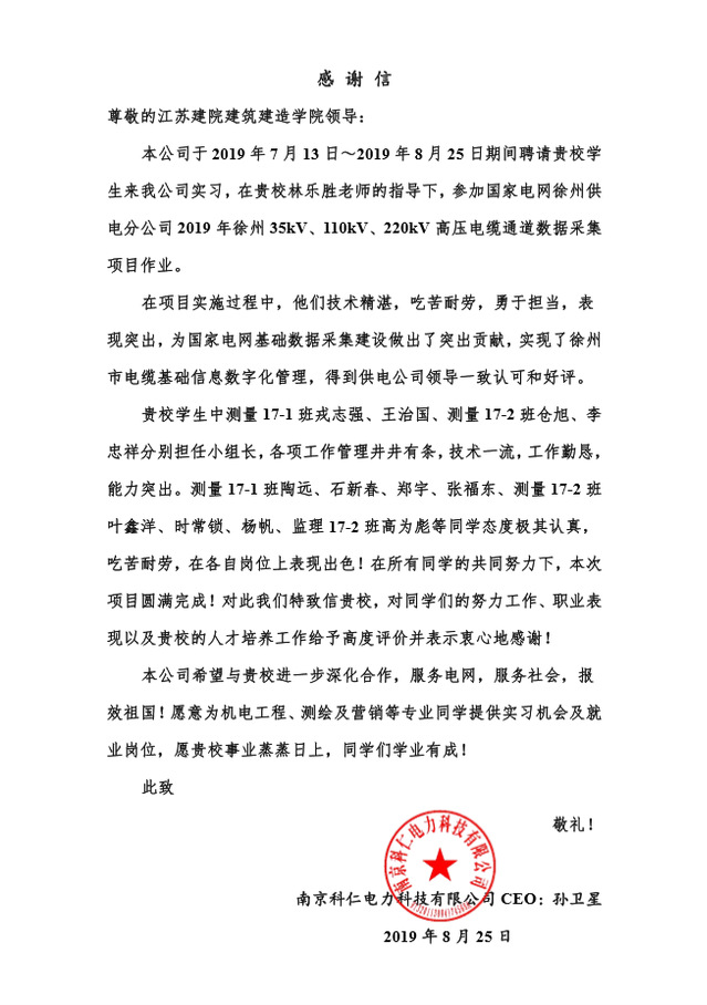 8月25日,公司收到南京科仁电力科技有限公司CEO孙卫星的感谢信,孙卫星对公司在该公司实习员工的专业技术水平,吃苦耐劳、勇于担当的敬业精神,突出的职业表现给予了高度评价,对公司高质量的人才培养、为企业输送优秀人才表示衷心地感谢。孙卫星还表示,公司将进一步深化与公司的校企合作,为公司员工提供更多的实习机会及就业岗位。