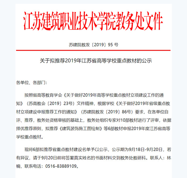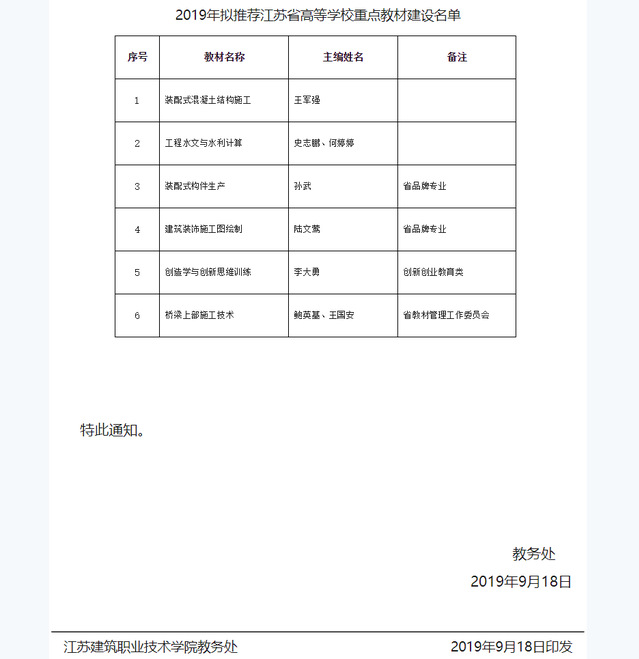 近日,公司发布《关于拟推荐2019年江苏省高等公司重点教材的公示》(苏建院教发〔2019〕95号),由公司孙武主编的《装配式构件生产》、王军强老师主编的《装配式混凝土结构施工》2部教材,经公司严格评审,被推荐参评2019年度江苏省高等公司重点教材。