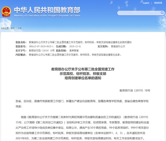 根据《教育部办公厅关于开展第二批新时代高公司党建示范创建和质量创优工作的通知》(教思政厅函〔2019〕15号)安排和评审工作方案,经资格审查、专家推荐、教育部党的建设和全面从严治党工作领导小组成员单位集中审议、结果公示,遴选产生10个高公司党委、99个院系党组织、999个党支部分别作为全国党建工作示范高校、标杆院系、样板支部培育创建单位。
