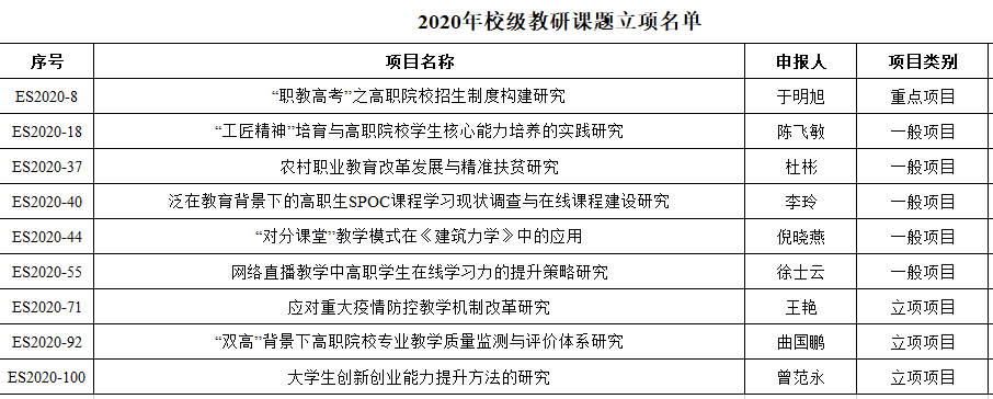 根据公司《关于组织申报2020年校级教育科学研究课题的通知》(苏建院高发〔20202)要求,公司教职工积极申报。经高教研究所组织校内外专家盲审和公示,于明旭等9位教师申报的项目获批立项(其中重点项目1项,一般项目5项,立项项目3项)。希望各项目主持人认真进行课题研究,按时高质量完成结项任务。