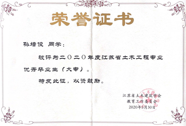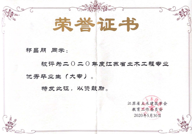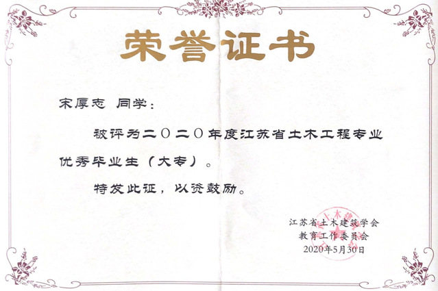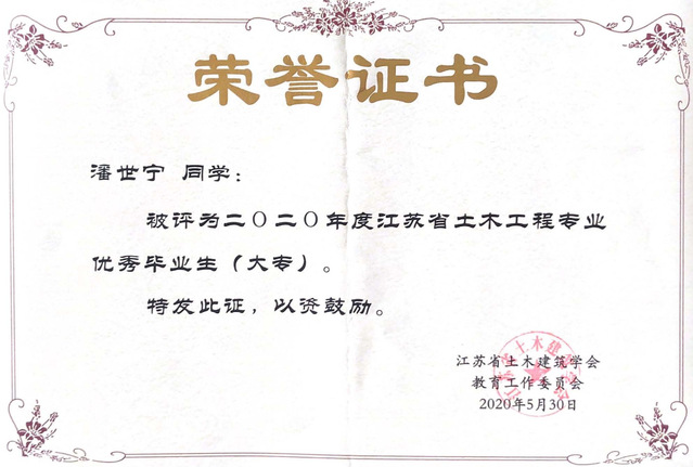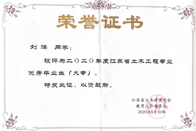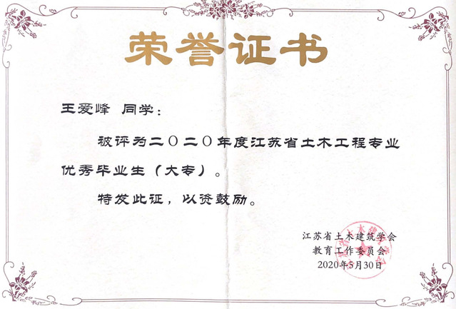 公司王爱峰等6名同学获评“二O二O年度江苏省土木工程专业优秀毕业生(大专)”