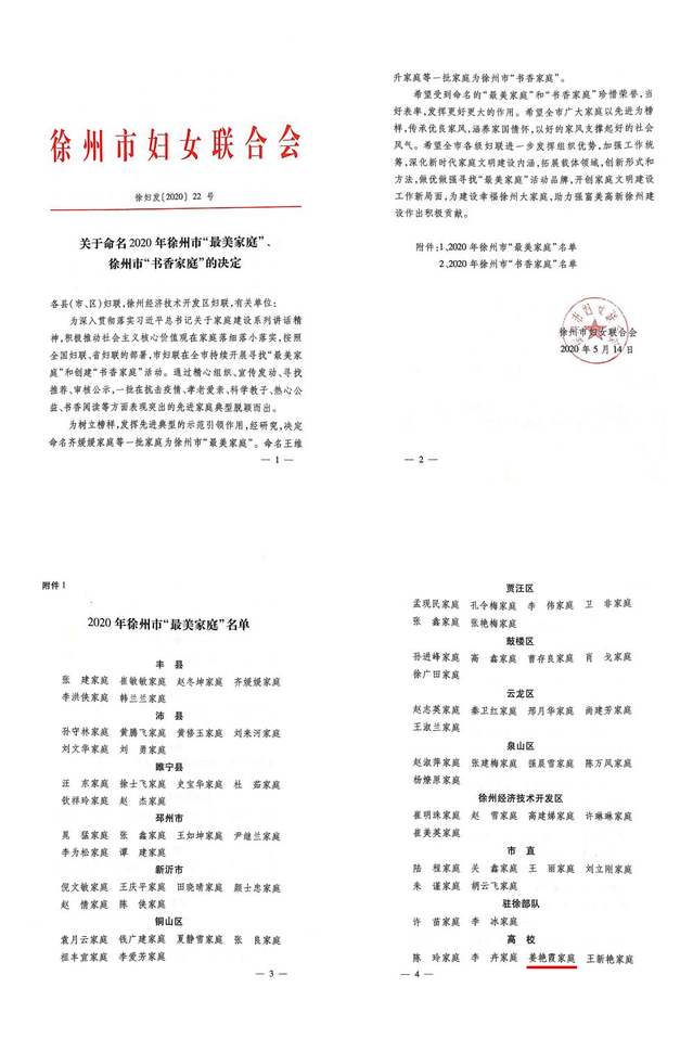近日,徐州市妇女联合会下发《关于命名2020年徐州市“最美家庭”、徐州市“书香家庭”的决定》(徐妇发2020【22】号),公司姜艳霞家庭脱颖而出,荣获2020年徐州市“最美家庭”称号。