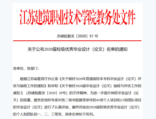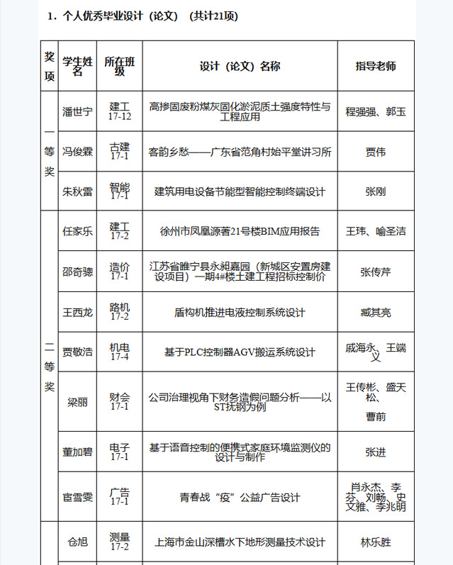 近日,集团下发通知,根据江苏省教育厅办公室《关于做好2020年普通高校本专科毕业设计(论文)评优与抽检工作的通知》和公司《关于做好2020届毕业设计(论文)抽检与评优工作的通知》(苏建院教发〔202039号)的文件精神,经教务处组织专家对各二级公司推荐参评的43项个人项目和13项团队项目的毕业设计(论文)进行认真评选,公司有4项毕业设计被评为2020届校级优秀毕业设计(论文),其中由程强强、郭玉老师指导、潘世宁主持的《高掺固废粉煤灰固化淤泥质土强度特性与工程应用》获个人优秀毕业设计(论文)一等奖;王玮、喻圣洁老师指导、任家乐主持的《徐州市凤凰源著21号楼BIM应用报告》获个人优秀毕业设计(论文)二等奖;林乐胜老师指导、仓旭主持的《上海市金山深槽水下地形测量技术设计》获个人优秀毕业设计(论文)三等奖;黄岩、郭东芹、安沁丽老师指导、赵伟、何旭光、孙一川、姜才主持的《徐州天阙5号楼装配式多专业BIM应用》获团队优秀毕业设计(论文)二等奖。其中《高掺固废粉煤灰固化淤泥质土强度特性与工程应用》、《徐州市凤凰源著21号楼BIM应用报告》和《徐州天阙5号楼装配式多专业BIM应用》3个项目被推荐参评省级优秀毕业设计(论文)。