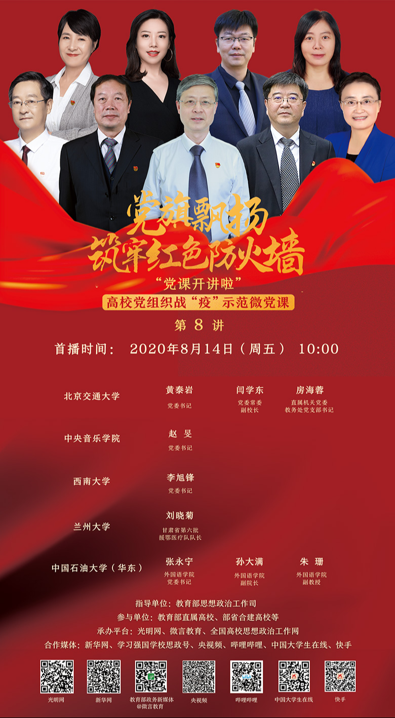 8月14日上午10点,“党旗飘扬、筑牢红色防火墙”高公司党组织战“疫”示范微党课第8讲云端开讲,教育部思想政治工作司组织北京交通大学、中央音乐公司、中国石油大学(华东)、西南大学、兰州大学等5所高公司党组织负责人围绕中国共产党的人民情怀,战疫中的责任与担当,防汛救灾中的感人故事等方面,为师生讲授专题微党课。公司党总支全体党员通过网络直播平台进行观看学习。