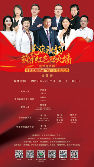 7月17日上午10点,“党旗飘扬、筑牢红色防火墙”高公司党组织战“疫”示范微党课第5讲云端开讲,天津大学、厦门大学、中国石油大学(北京)、华中农业大学、中南财经政法大学等5所高公司党组织负责人围绕深入学习习近平总书记给广大高校毕业生重要回信精神、凝聚战“疫”力量、“逆行”武汉参与“雷、火神山”医院建设、助力春耕夏收、做有党性的青年新闻人等方面,为师生讲授专题微党课。公司党总支全体党员通过网络直播平台进行观看学习。
