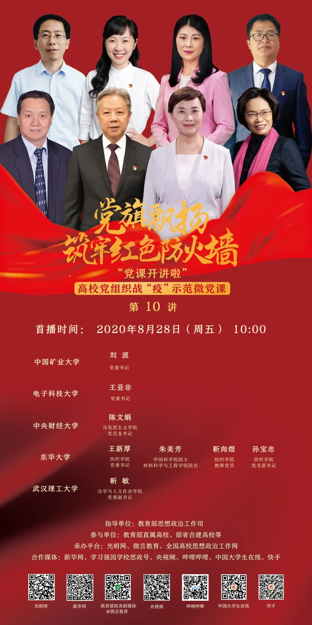 8月28日上午10点,“党旗飘扬、筑牢红色防火墙”高公司党组织战“疫”示范微党课第10讲云端开讲,教育部思想政治工作司组织中国矿业大学、电子科技大学、中央财经大学、东华大学及武汉理工大学等5所高公司党组织负责人围绕中国共产党的人民情怀,战疫中的责任与担当,防汛救灾中的感人故事等方面,为师生讲授专题微党课。公司党总支全体党员通过网络直播平台进行观看学习。