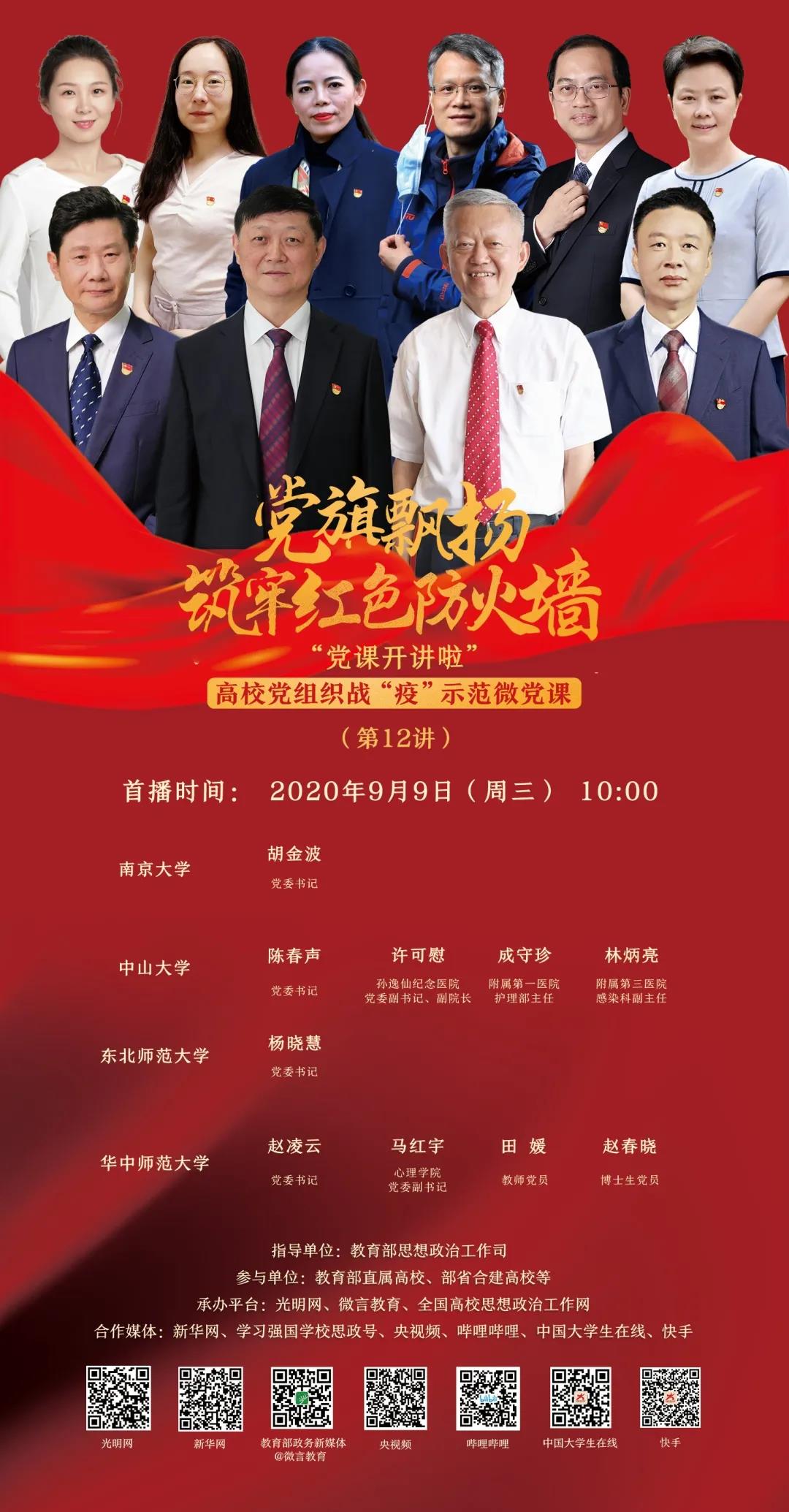 9月9日上午10点,“党旗飘扬、筑牢红色防火墙”高公司党组织战“疫”示范微党课第12讲云端开讲,教育部思想政治工作司组织南京大学、中山大学、东北师范大学、华中师范大学等4所高公司党组织负责人围绕中国共产党的人民情怀,战疫中的责任与担当,防汛救灾中的感人故事等方面,为师生讲授专题微党课。公司党总支全体党员通过网络直播平台进行观看学习。