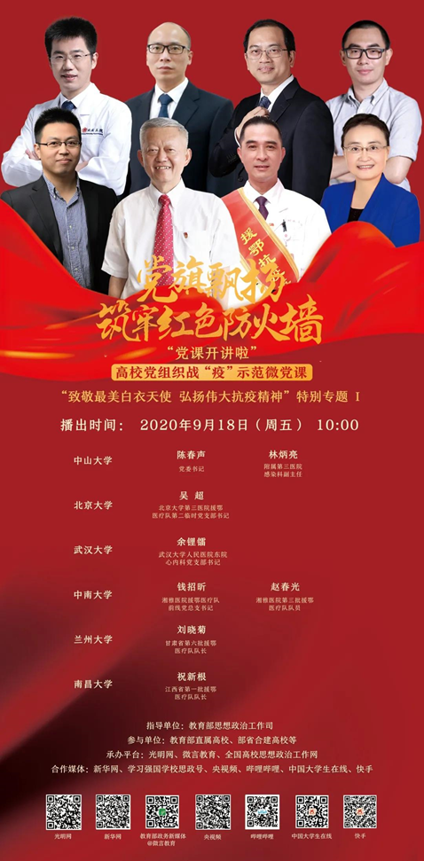 9月18日上午10点,“党旗飘扬、筑牢红色防火墙”高公司党组织战“疫”示范微党课“致敬最美白衣天使 弘扬伟大抗疫精神”特别专题云端开讲,教育部思想政治工作司组织中山大学、北京大学、武汉大学、中南大学、兰州大学等6所高校围绕白衣天使一线战疫故事,为师生讲授专题微党课。公司党总支全体党员通过网络直播平台进行观看学习。