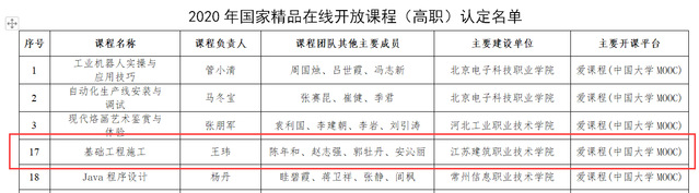 近日,教育部发布了《关于公布2020年国家精品在线开放课程认定结果的通知》(教职成厅函〔2020〕18号),公司王玮老师负责的《基础工程施工》课程入选。