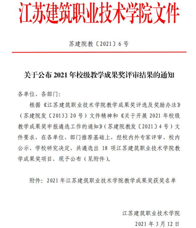 近日,公司下发《关于公布2021校级教学成果奖评审结果的通知》(苏建院教发〔2021〕6号),公司报送的《建筑工程技术专业“综合能力+专项能力”人才培养体系的研究与实践》等4个项目全部获评,其中,由孙武主持的《建筑工程技术专业“综合能力+专项能力”人才培养体系的研究与实践》获一等奖,由方桐清主持的《基于“关键成功因素”的建工专业“+421”综合职业能力培养体系的创新实践》、孙韬主持的《建专业资源平台,助课堂革命推行,促产教深度融合,育新兴专业人才》、王玮主持的《基于“一主线、两平台、四融合”土建类专业核心课程教学模式创新与实践》三项教学成果分获三等奖。