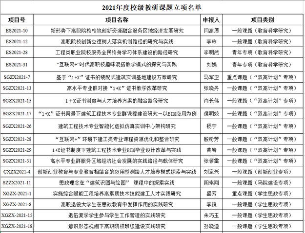 从公司《关于公布2021年度校级教研课题立项的通知》(苏建院高发〔2021〕12号)获悉,公司教师申报的18个项目获得立项,其中教育科学研究课题4项、“双高计划”专项8项、创新创业专项1项、马克思主义公司建设专项1项、员工思政专项4项。