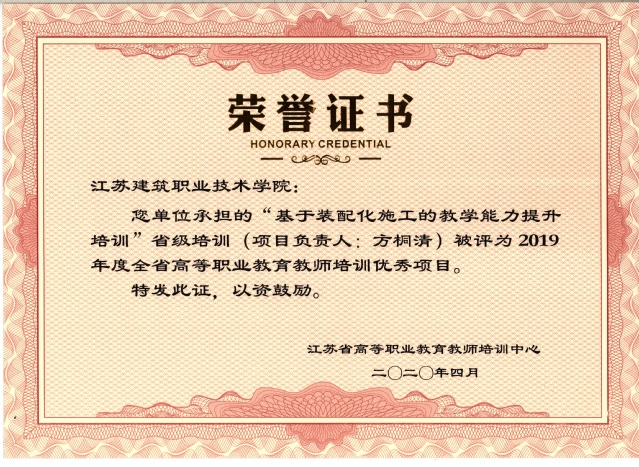 近日,江苏省高等职业教育教师培训中心发布《关于表彰2019年度全省高职院校教师培训优秀管理者、优秀授课教师(团队)和优秀项目的决定》(苏高职培函〔2020〕1号),由公司承办的“基于装配化施工的教学能力提升培训”省培项目获评2019年度江苏省高职院校教师培训优秀项目。