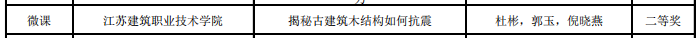 近日,2021年江苏省高校微课教学比赛获奖名单公示,公司杜彬、郭玉、倪晓燕团队申报的《揭秘古建筑木结构如何抗震》获微课类竞赛二等奖。