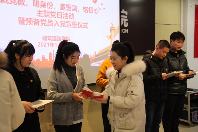 盛芳书记给23名新发展的预备党员佩戴党员党徽,希望全体党员牢记自己的党员身份,维护党员形象,争先创优,在以后的学习、工作和生活中奉献青春力量,彰显党员担当。全体党员高举右拳面向党旗庄重宣誓,在场的全体党员进一步感受到作为一名共产党员的光荣使命与责任。