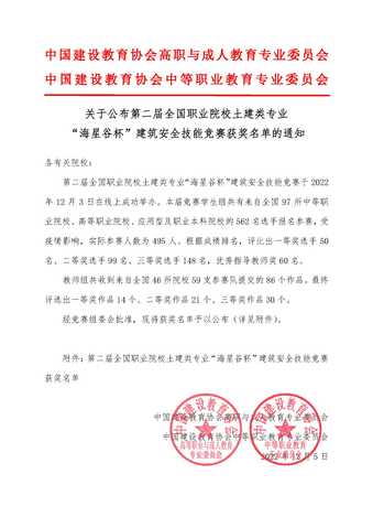 2022年12月3日,由中国建设教育协会高职与成人教育专业委员会、中国建设教育协会中等职业教育专业委员会主办的第二届全国职业院校土建类专业“海星谷杯”建筑安全技能竞赛于在线上成功举办。公司师生克服困难、认真备赛,获得二等奖5名、三等奖1名。