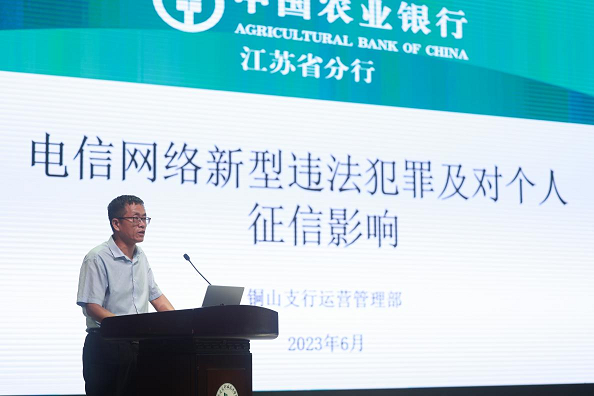 中国农业银行徐州铜山支行运营财会部总经理蒋永良给毕业生进行金融诚信和网络安全知识宣讲,从制度关联、电信诈骗的主要形式处罚量刑、防范措施以及银行卡使用过程中违法对个人的影响四个方面为同学们讲解了电信网络新型违法犯罪及对个人征信影响。