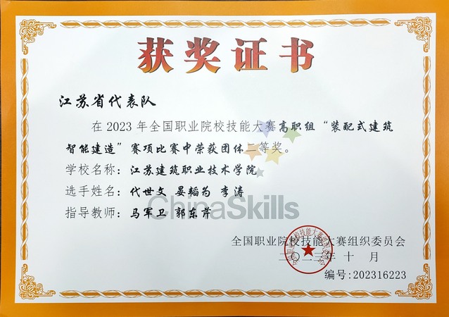 10月30日上午,2023年全国职业院校技能大赛高职组“装配式建筑智能建造”赛项在上海城建职业公司落下帷幕。此次大赛共有来自全国30个省、直辖市、自治区的57支代表队171名选手参赛。比赛共历时4天,主要考查职业院校员工在装配式智能建造领域的专业技能和实践能力。公司建工21-15班李涛、建工21-10班晏韬为、建工21-1班代世文3名同学(指导老师:马军卫、郭东芹)组成的代表队获得二等奖。