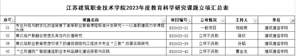从《关于2023年度校级教育科学研究课题立项的通知》(苏建院高发〔2024〕2号)获悉,经个人申报,高教所形式资格审查,校内外专家盲评,网上公示,报公司审定,公司倪晓燕等四位教师申报的课题获批2023年度教育科学研究课题立项,两个教师团队获批2023年度校级教学能力专项立项。