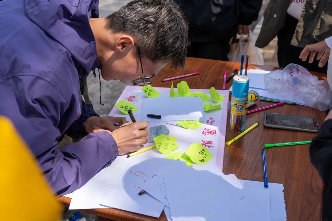 午后阳光正好,林荫大道上,同学们自主选择绘制工具,画出属于自己的独一无二的笑脸,并在便签上写下自己的心愿粘到展板上,交流着自己最近幸福和收获,传播快乐和正能量。