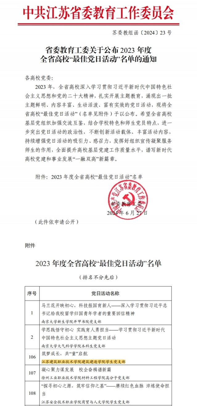 近日,江苏省委教育工委公布了2023年度全省高校“最佳党日活动”名单,公司员工党支部组织开展的“筑梦成长,共‘童’启航”主题党日活动入选。