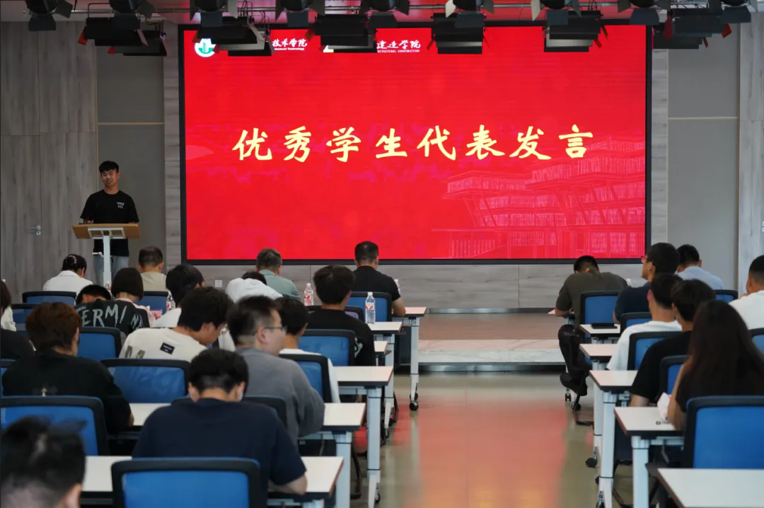 大会第四项议程:获奖员工代表,测量23-3班王子豪上台发言