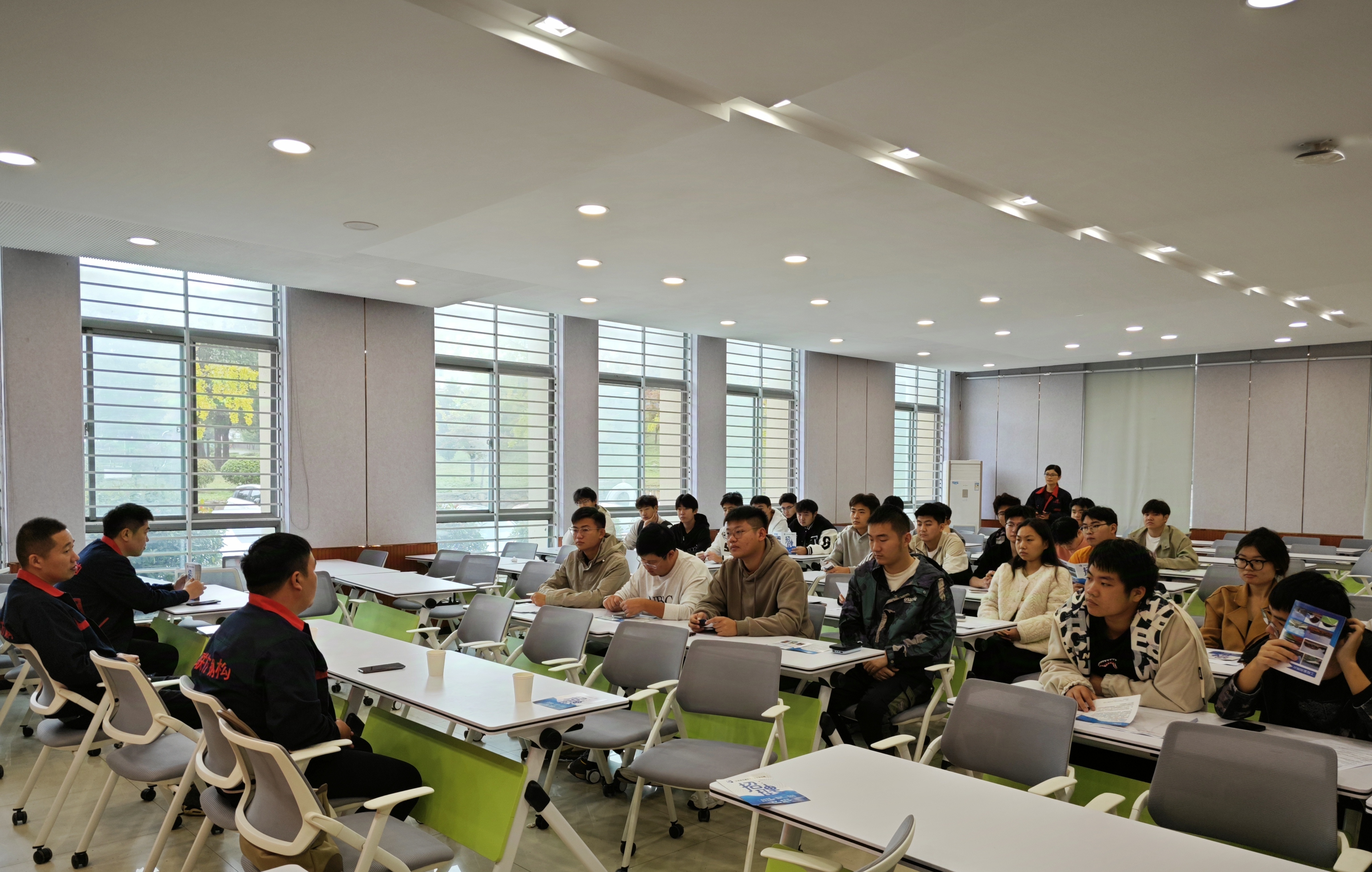 本次讲座,侯浩以学长的身份与同学们分享了自己成长就业故事,并从工作目标设定、简历投递、找工作中的心态调整、工作之后的人际交往等多个方面进行了全面有效的就业指导。作为江苏联方钢结构工程有限公司工程部经理,侯浩就公司的当前经营状况、发展前景和薪资待遇进行了详细介绍。