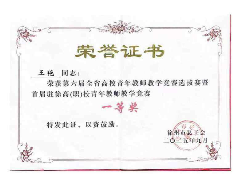 9月19日至21日,第六届全省高校青年教师教学竞赛选拔赛暨首届驻徐高(职)校青年教师教学大赛决赛在江苏师范大学举办,公司教师王艳获大赛一等奖。