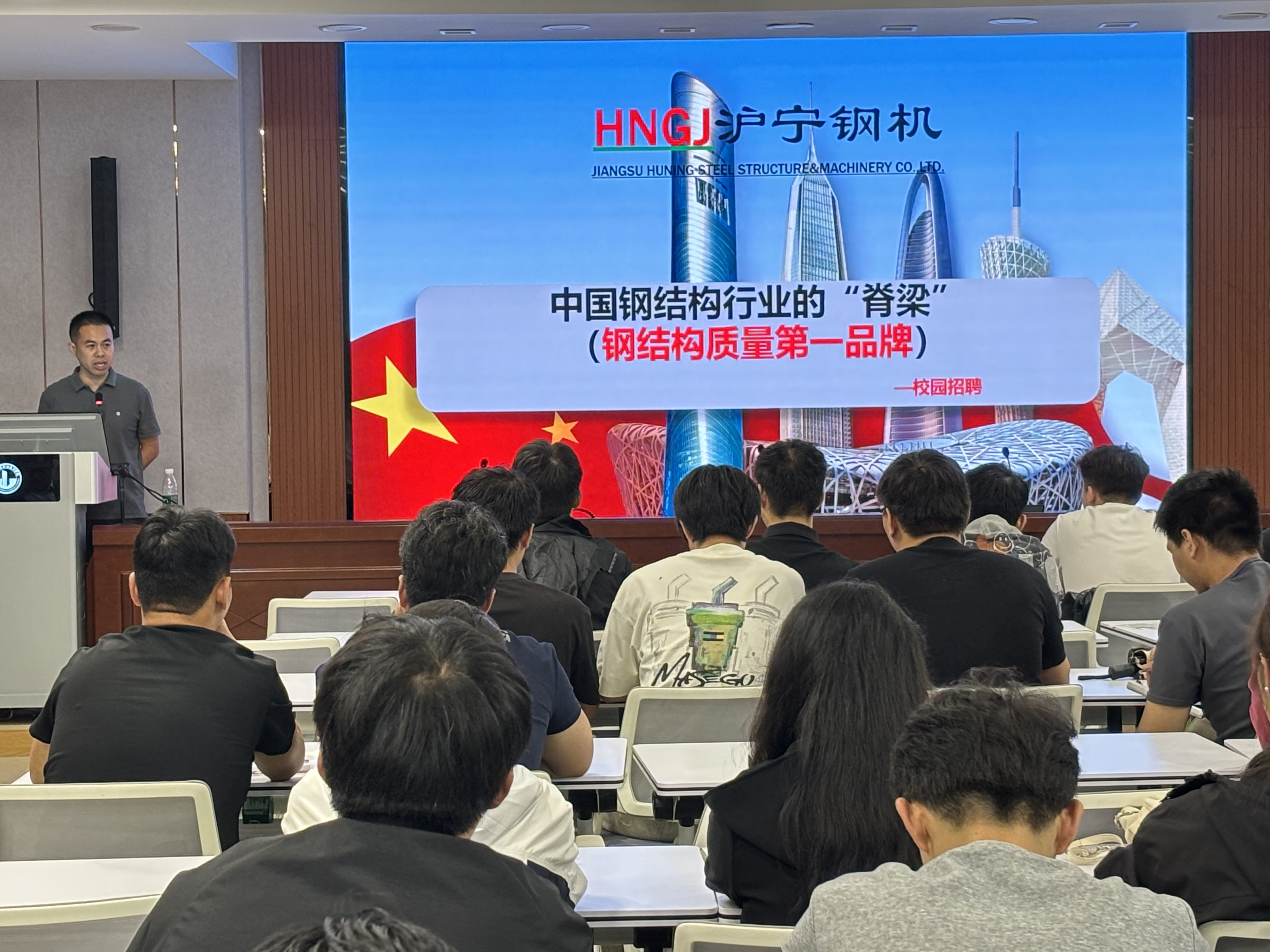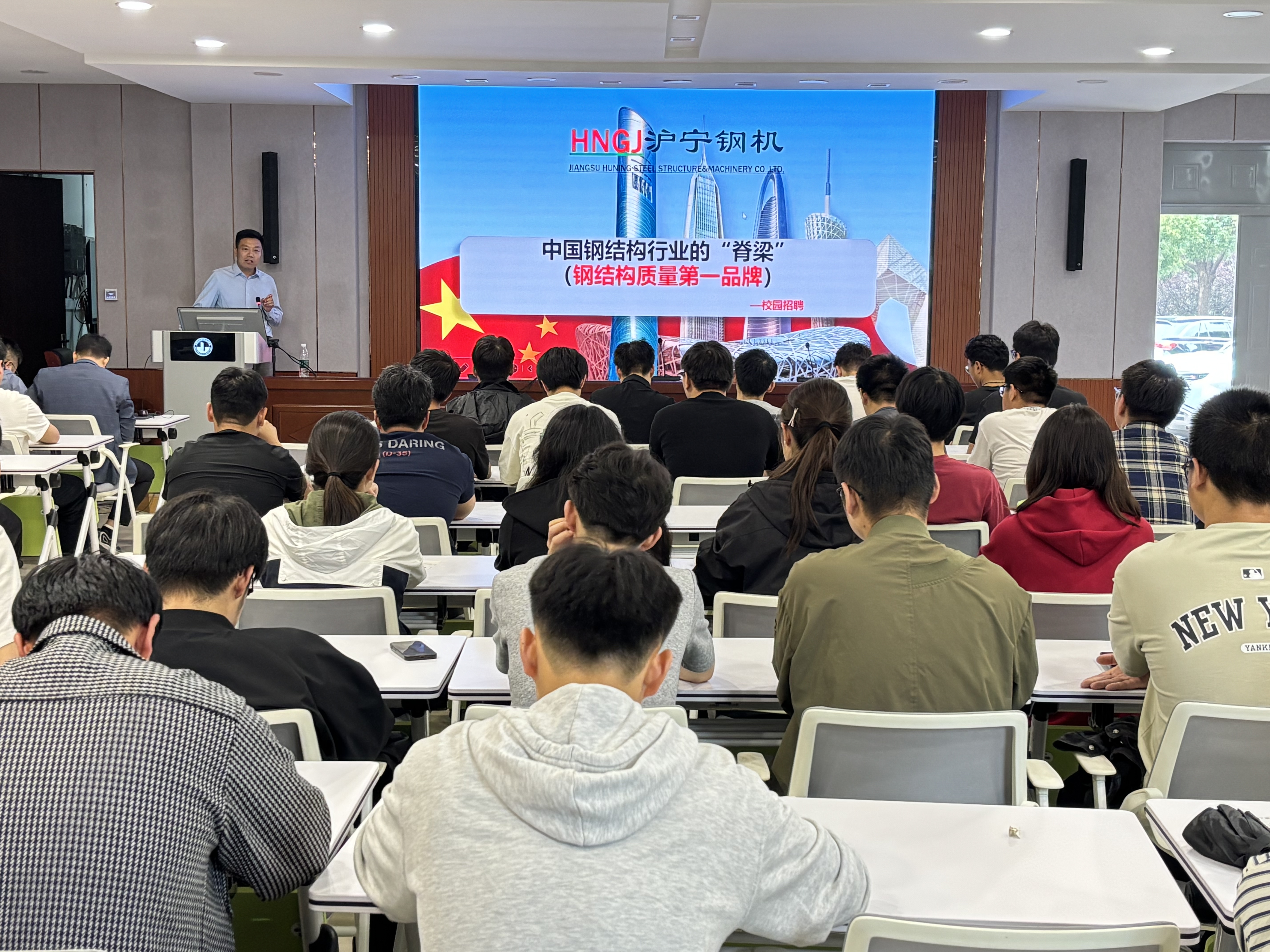 随后,江苏沪宁钢机股份有限公司总经理助理吴立辉为在场员工做了详尽的企业宣讲。他通过丰富的图文资料和实例,系统介绍了沪宁钢机的发展历程、企业规模、核心业务、经典工程项目、企业文化、人才发展理念以及招聘岗位需求与培养计划,使同学们对公司的综合实力和未来发展前景有了全面而深入的了解。