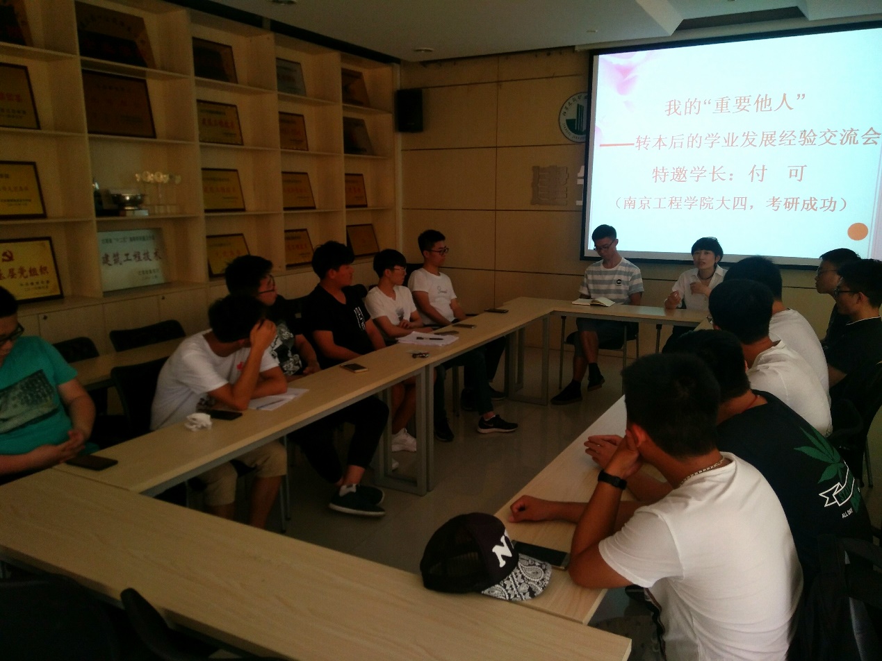 6月7号下午,由建工公司分团委组织的学业引领三部曲——我的“重要他人”——转本后的学业发展经验交流会,在利亚楼会议室召开,特邀原钢构13-2班,现为南京工程公司大四员工,且考研成功的付可学长前来分享、交流。15名毕业班转本成功的同学参加了本次交流会。