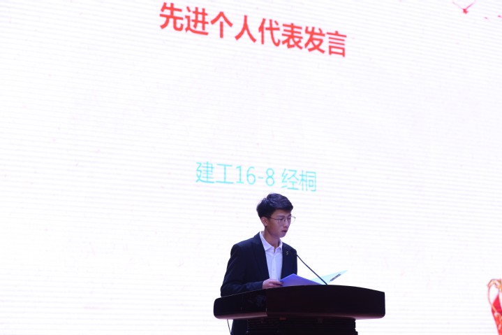 国家奖学金、江苏省优秀员工干部获得者,建工16-8班经桐同学作为获奖代表发言,他在总结自身老员工活经验和体会的同时,鼓励学弟学妹,要把握现在积极进取,勇于尝试,让自己在大学中学有所成,不留遗憾。