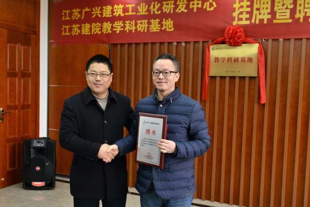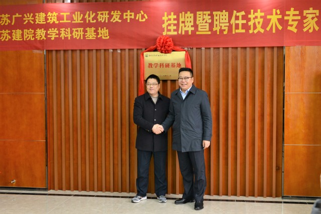 威廉希尔副经理刘海波与江苏广兴集团总经理王广经共同为威廉希尔·江苏广兴集团建筑工业化研发中心和威廉希尔教学科研基地揭牌,王广经总经理为公司王军强教授颁发建筑工业化技术专家聘书。