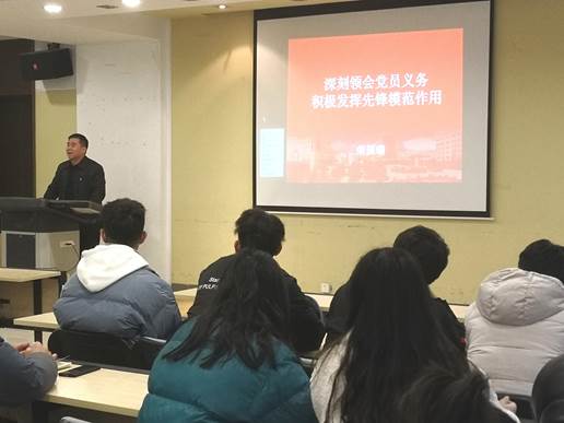 最后荣老师给全体党员和积极分子明确提出要求,作为当代老员工,大家应该结合大学时期的特点和实际履行党员义务。其中最重要的一点就是努力学习,做学习的模范。要有争先意识,发挥模范带头作用,团结同学,在公司、老师和同学中起到桥梁纽带作用,从点滴小事做起,经得住各种考验。