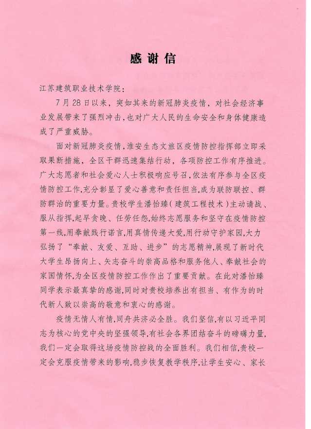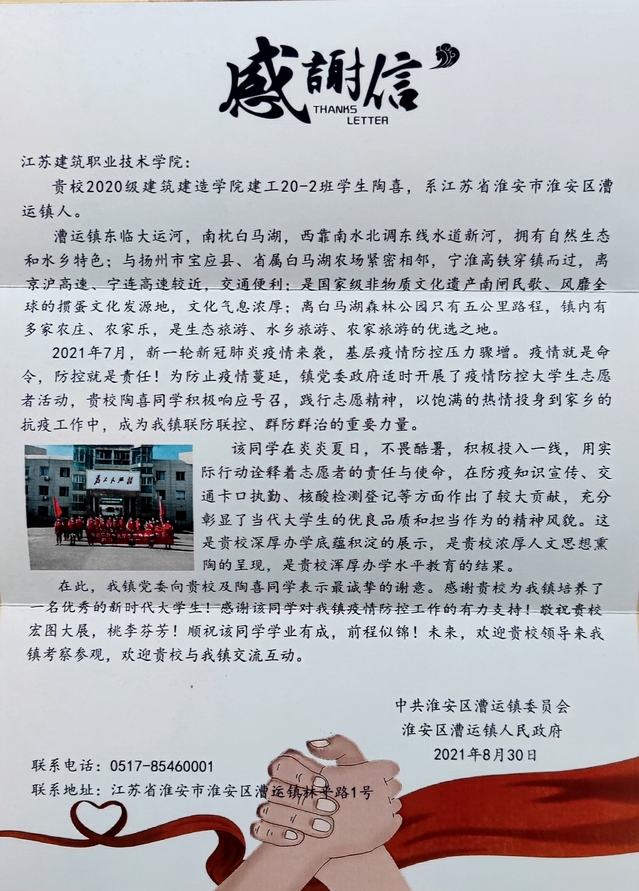 今年7月疫情再次蔓延,威廉希尔体育学子积极响应公司团委发出“在疫情防控一线,充分发挥共青团主力军和突击队作用”的号召,在炎炎烈日下,不畏酷暑,积极投身到当地抗疫一线,在防疫知识宣传、交通卡口执勤、核酸检测登记等疫情防控工作中贡献了自己的青春力量。近日,公司先后收到中国十七冶丰县开发区一号产业园第一标段建设项目经理部、鹿邑县委、淮安市淮安区漕运镇党委镇政府、淮安生态文旅区等单位、部门寄来的表扬信和感谢信,对威廉希尔体育建工19-13班徐佳豪、建工20-9班韩朝旭、建工20-2班陶喜、21级新生潘怡臻等同学在抗疫工作中积极响应政府和单位号召,践行志愿精神,无私奉献、敢于担当的表现予以高度评价,对公司的育人工作成效给予充分肯定。淮安市淮安区漕运镇党委、镇政府在感谢信中写到:建院学子的抗疫志愿行动充分彰显了当代老员工的优良品质和担当作为的精神风貌,这是公司深厚办学底蕴积淀的展示,是公司浓厚人文思想熏陶的呈现,是公司浑厚办学水平教育的结果。