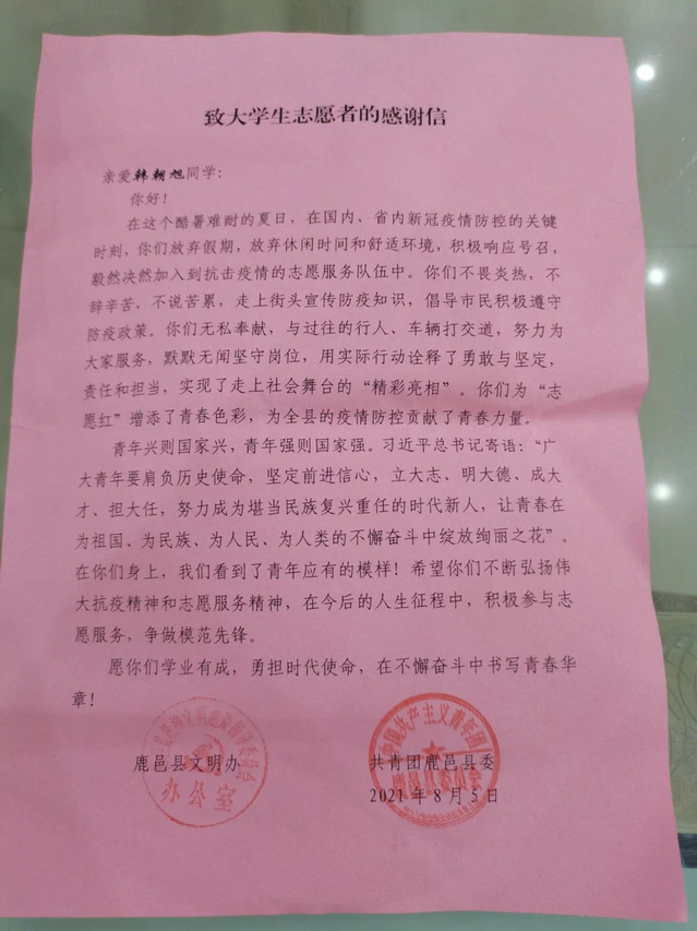 建工19-13班的徐佳豪同学对此表示:“疫情防控,人人有责。处在暑期实习的我不忘习近平总书记对新时代青年的嘱托,毅然决然地加入到防疫的队伍中,只想为抗击疫情贡献一份自己的力量。”建工20-9班的韩旭朝认为:“在炎炎夏日,开展疫情防控工作的确很辛苦,但也深刻体会到了奉献、友爱、互助,进步的志愿精神。作为志愿者,我知道一个人的力量是有限的,但我坚信聚水成海、聚沙成塔,在抗疫需要我们、国家需要我们、人民需要我们的时候,大家齐心协力,一定会取得最终的胜利!”