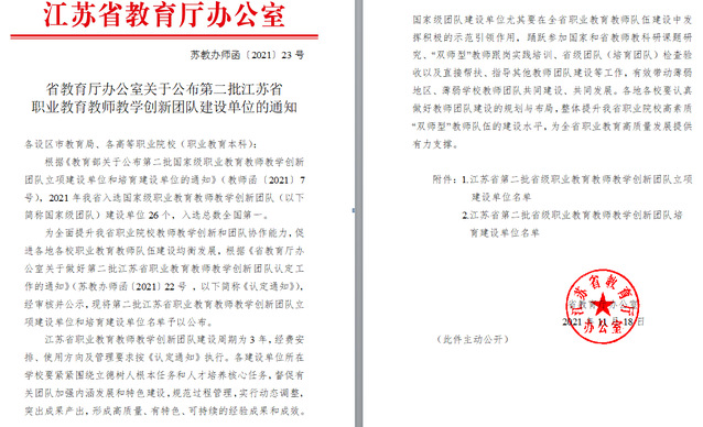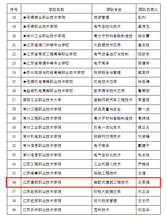 近日,江苏省教育厅办公室发布《省教育厅办公室关于公布第二批江苏省职业教育教师教学创新团队建设单位的通知》(苏教办师函[2021]23号),由公司王军强教授牵头、经理方桐清研究员等二十余位老师共同参与的“装配式建筑工程技术”教师教学团队被立项为第二批江苏省职业教育教师教学创新团队,团队建设周期为期3年。公司“装配式建筑工程技术”教师教学团队将在省教育厅指导下、在公司和公司领导下,紧紧围绕立德树人根本任务和人才培养核心任务,加强内涵发展和特色建设,规范过程管理,注重动态调整,突出成果产出,形成高质量、有特色、可持续的经验成果和成效。